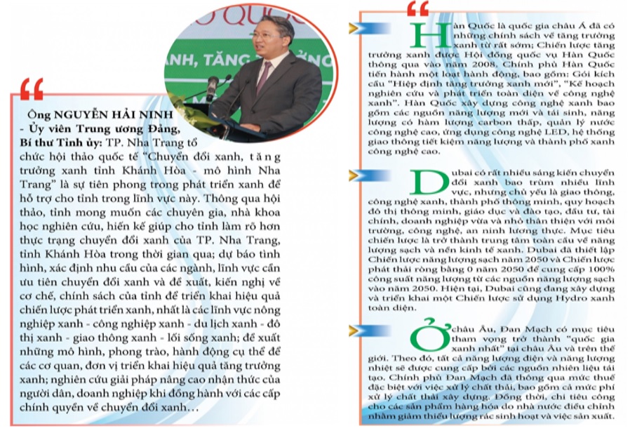 Tham gia hội thảo, các chuyên gia, nhà khoa học của Việt Nam và thế giới đều có chung nhận định, đã đến lúc cần hành động vì một thế giới xanh. Chuyển đổi xanh, phát triển xanh trở thành thách thức sống còn cho sự phát triển chung. Đối với TP. Nha Trang, qua 100 năm xây dựng và phát triển, thành phố đã có những bước phát triển vượt bậc; trở thành đô thị loại I, là trung tâm kinh tế, chính trị, văn hóa, giáo dục, khoa học kỹ thuật và du lịch của tỉnh. Nha Trang hội tụ đầy đủ các điều kiện để xây dựng thành phố trở thành trung tâm của các sự kiện kinh tế, chính trị, văn hóa, thể thao và du lịch tầm quốc gia, khu vực và quốc tế. Chính vì vậy, chuyển đổi xanh gần như là một yêu cầu tất yếu đối với quá trình phát triển của thành phố. Song song với việc phát triển kinh tế, nâng cao chất lượng cuộc sống của người dân, vấn đề biến đổi khí hậu, bảo vệ môi trường cũng cần được quan tâm và có giải pháp lâu dài, đồng bộ nhằm tạo ra sự phát triển bền vững, hài hòa.