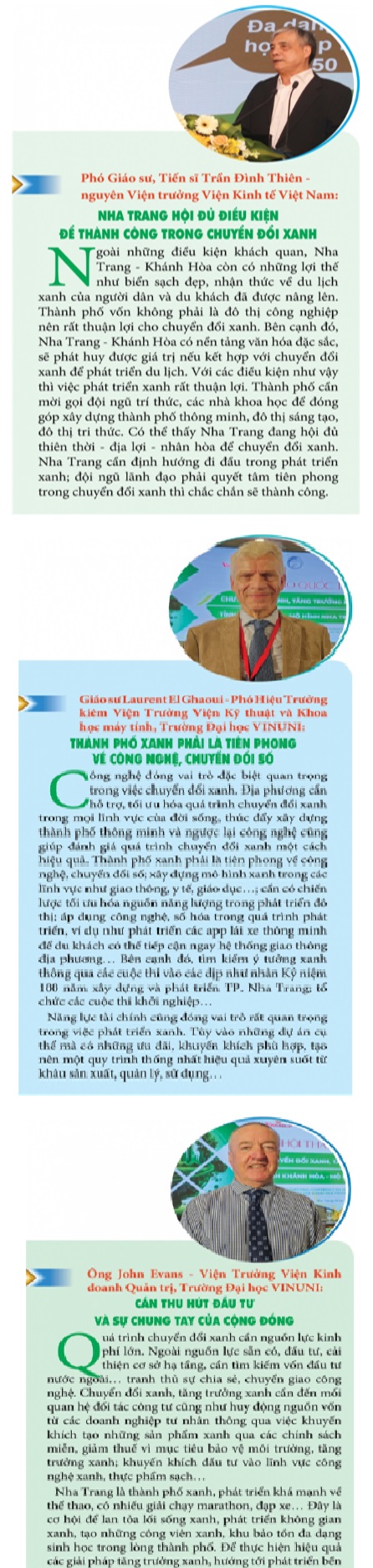 Phó Giáo sư, Tiến sĩ Trần Đình Thiên – nguyên Viện trưởng Viện Kinh tế Việt Nam cho rằng, với tốc độ tăng dân số như hiện nay, việc khai thác tài nguyên quá mức dẫn đến tàn phá môi trường; cùng với đó, hiện tượng hiệu ứng nhà kính, biến đổi khí hậu, nhiệt độ tăng nhanh, phát thải CO2 tăng cao, ô nhiễm môi trường ngày càng trầm trọng. Nếu không chuyển đổi xanh, nguy cơ tự diệt ngày càng hiển hiện. Nha Trang hội đủ điều kiện để trở thành địa phương tiên phong trở thành “tọa độ” xanh của cả nước. Nếu quyết tâm thực hiện, địa phương chắc chắn sẽ nhận được sự ủng hộ của Chính phủ cũng như quốc tế.