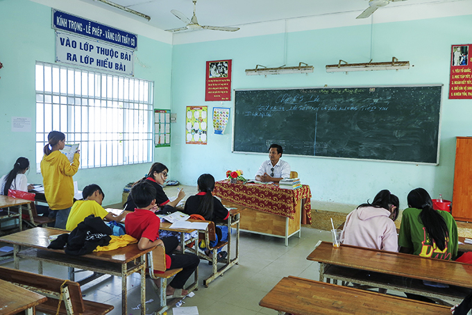 Giáo viên Trường THCS Võ Văn Ký dạy phổ cập cho các học sinh lớp 6 ở đảo Bích Đầm. |